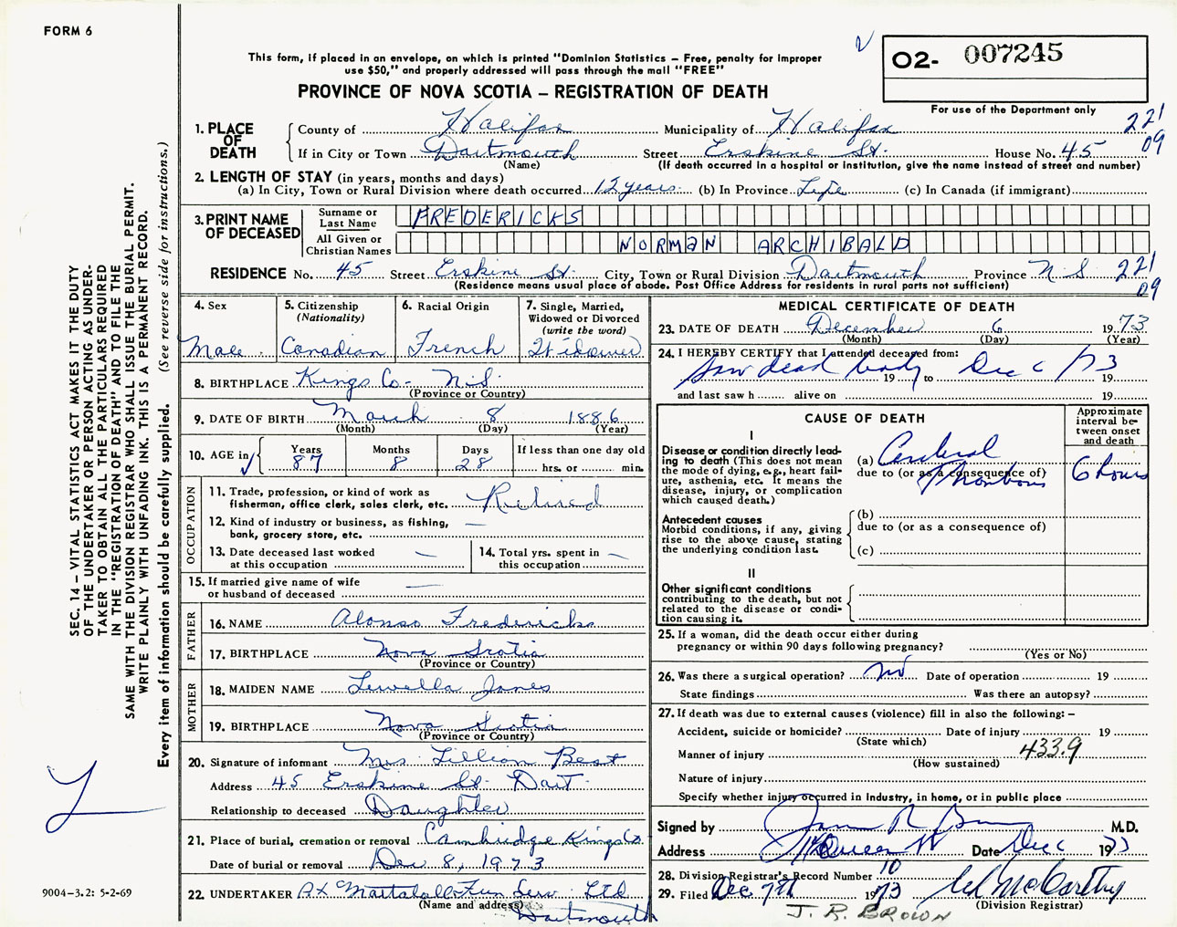Male Death Registration: Year: 1973 number: 7245
