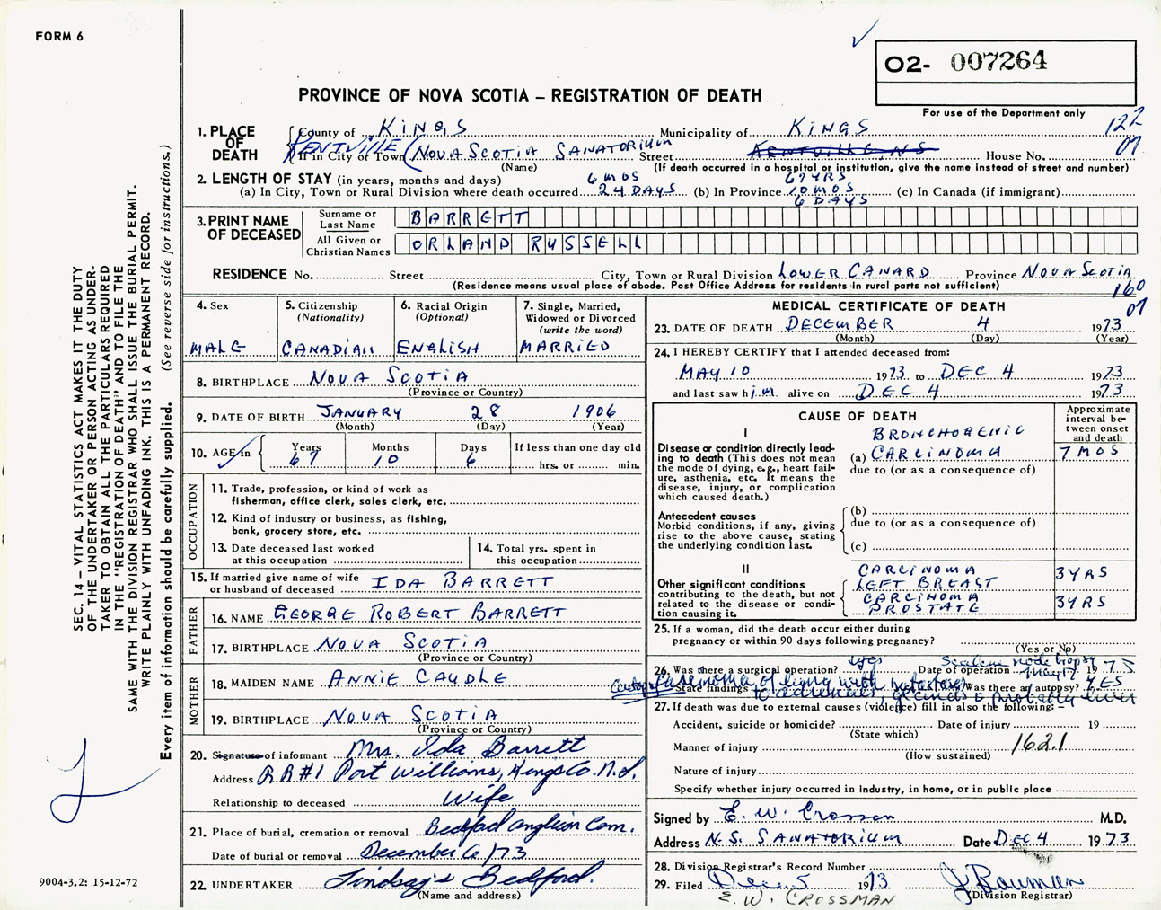 Male Death Registration: Year: 1973 number: 7264