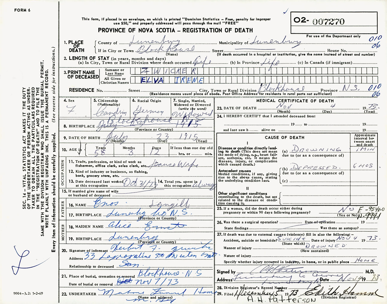 Female Death Registration: Year: 1973 number: 7270