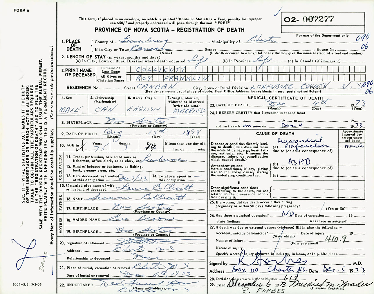 Male Death Registration: Year: 1973 number: 7277