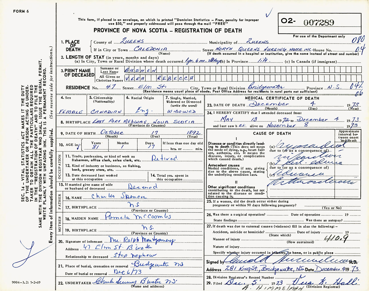 Female Death Registration: Year: 1973 number: 7289