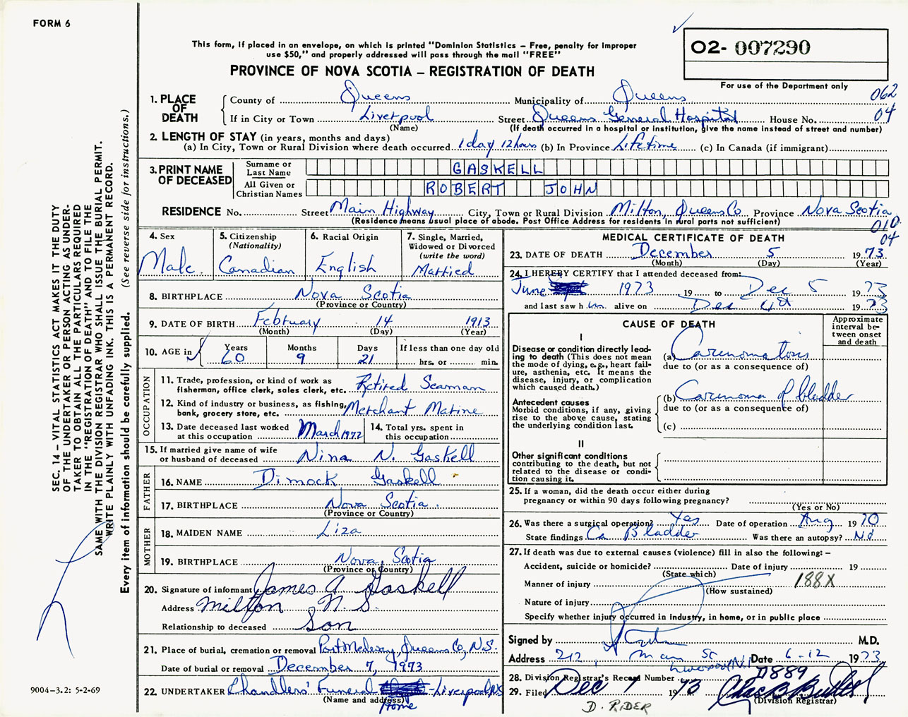 Male Death Registration: Year: 1973 number: 7290