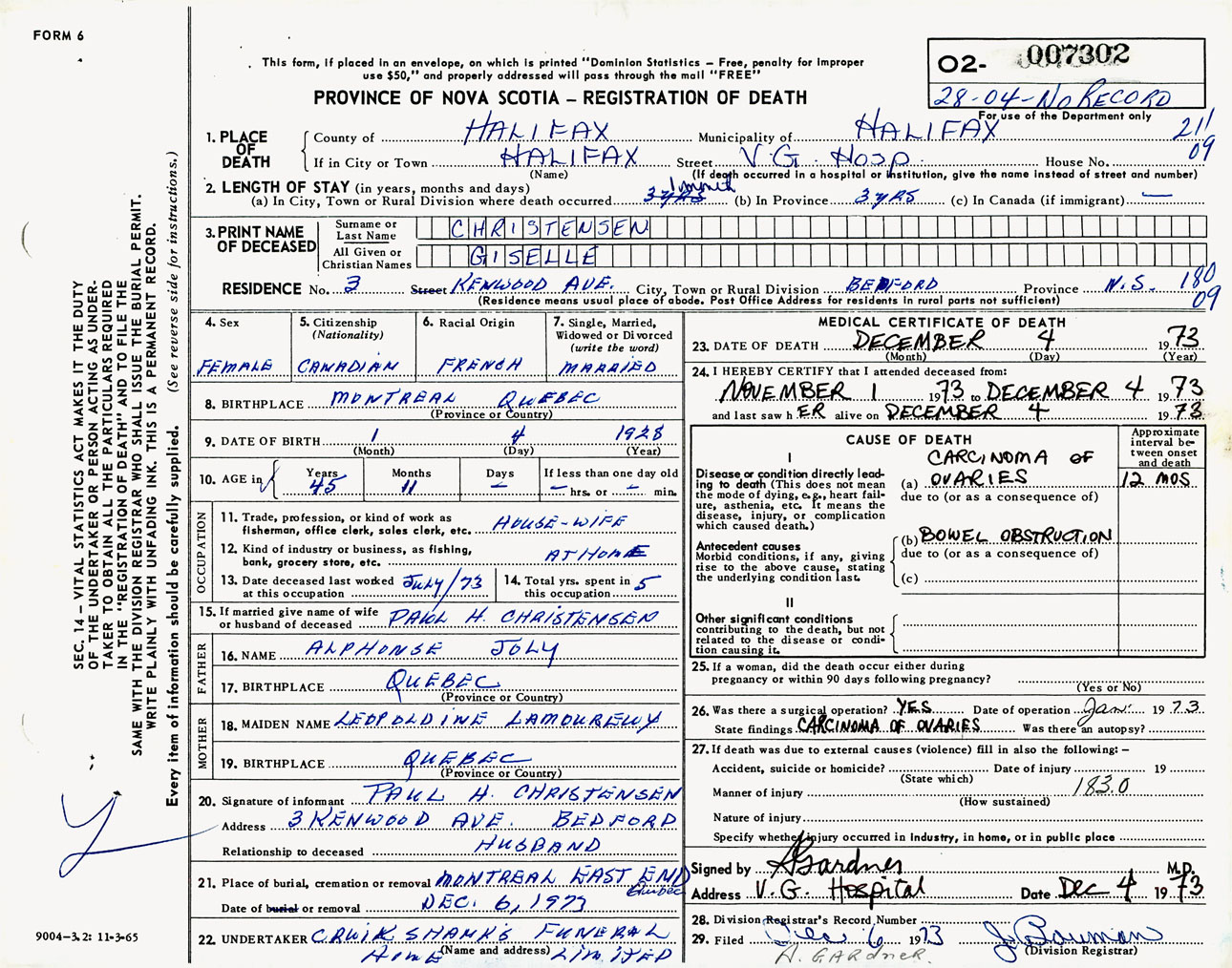 Female Death Registration: Year: 1973 number: 7302