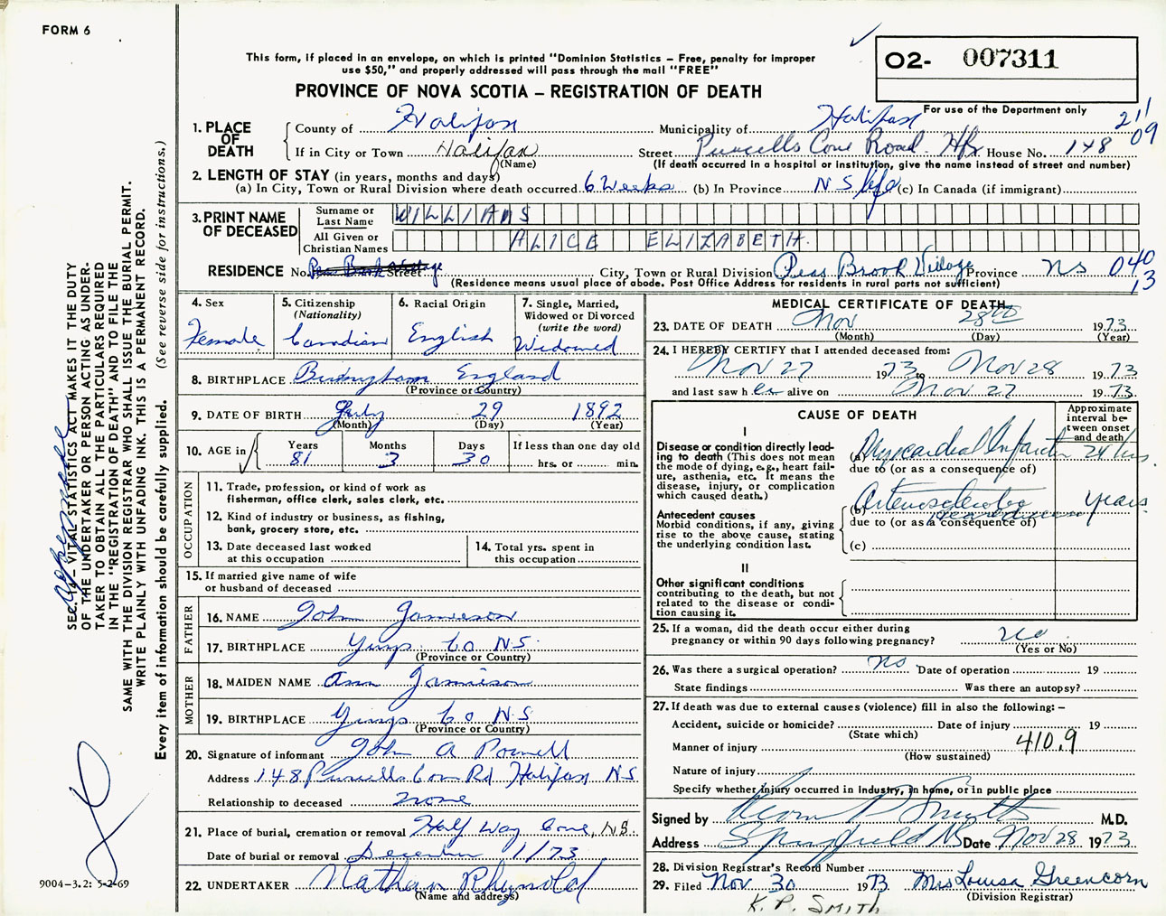 Female Death Registration: Year: 1973 number: 7311