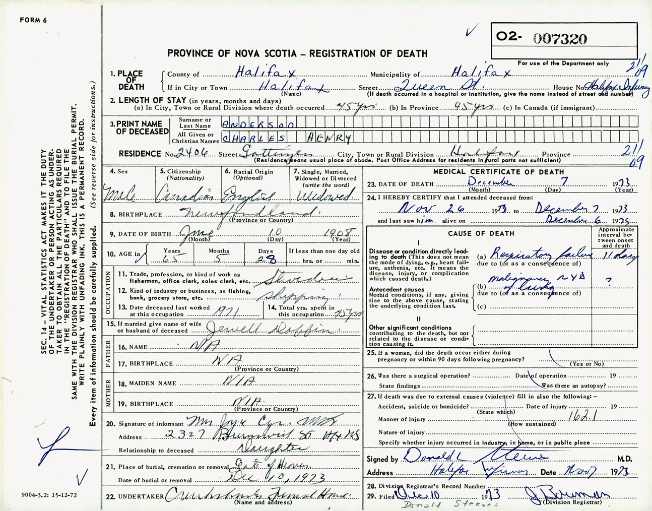 Male Death Registration: Year: 1973 number: 7320