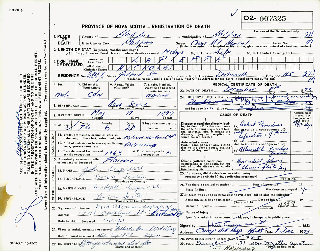 Male Death Registration: Year: 1973 number: 7325