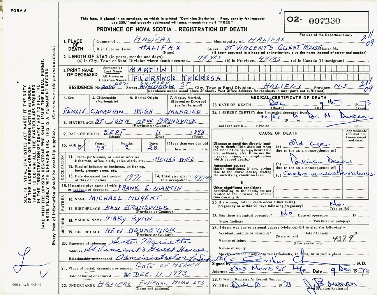 Female Death Registration: Year: 1973 number: 7330