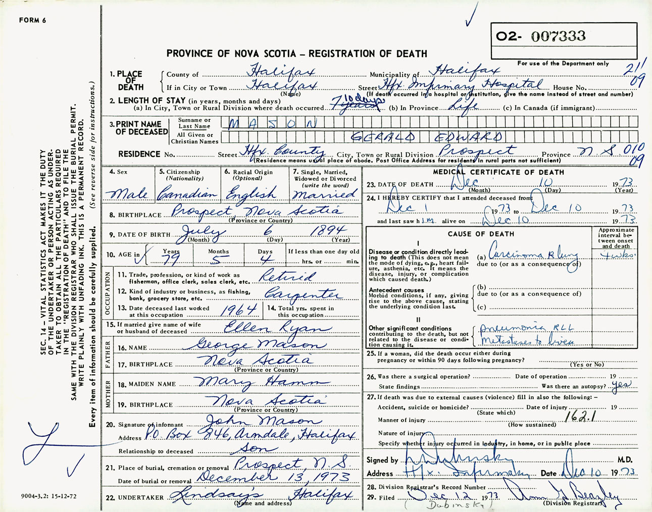 Male Death Registration: Year: 1973 number: 7333