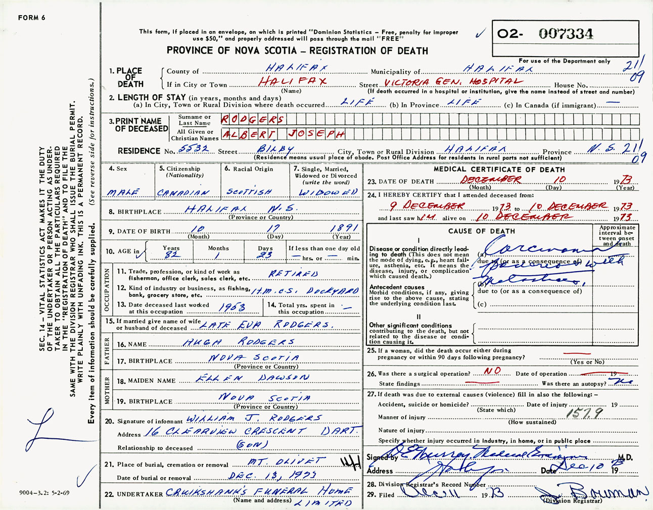 Male Death Registration: Year: 1973 number: 7334