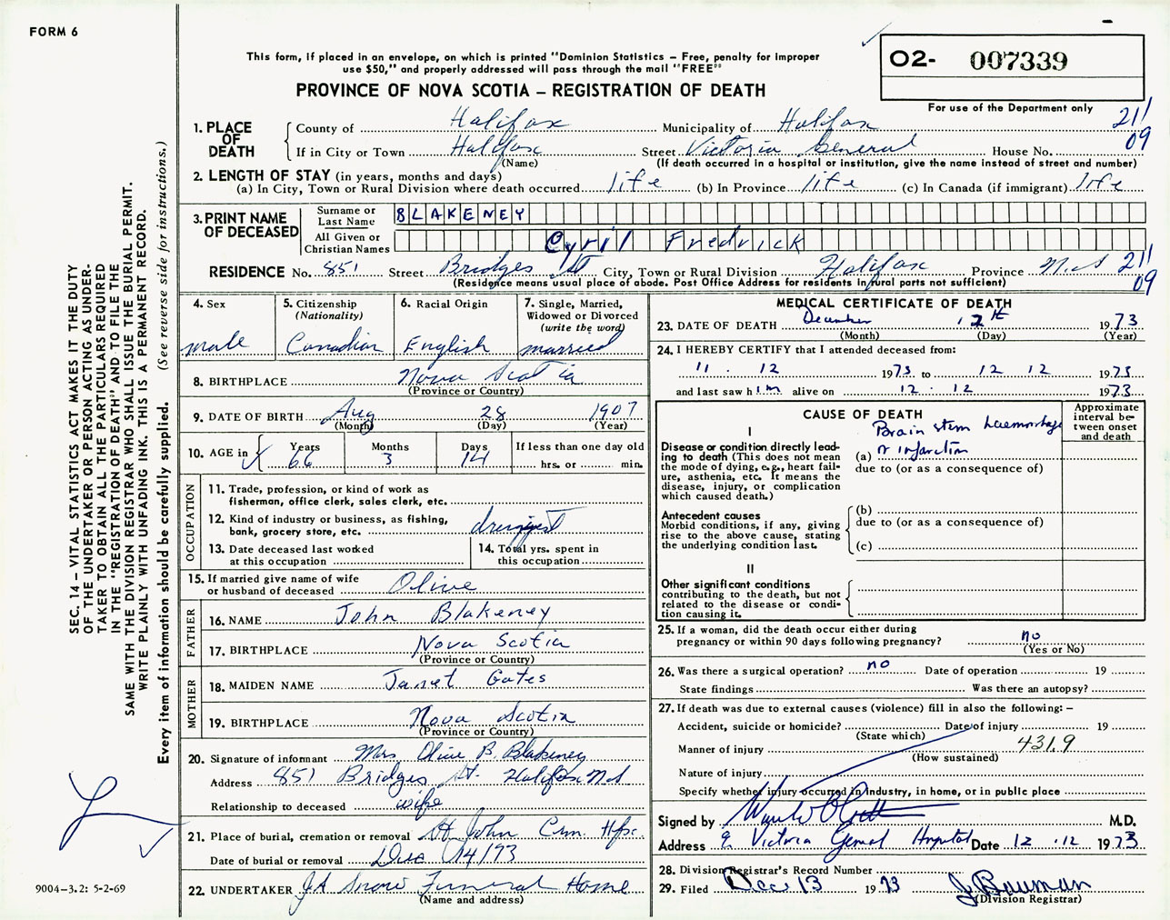 Male Death Registration: Year: 1973 number: 7339