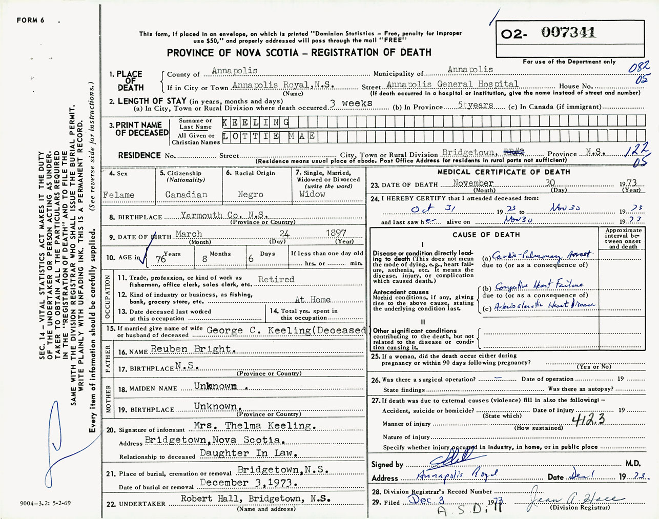 Female Death Registration: Year: 1973 number: 7341