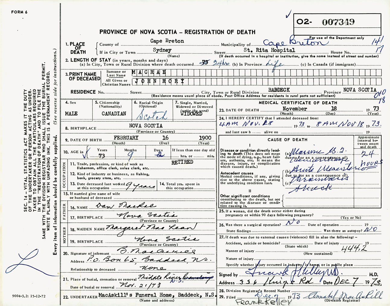 Male Death Registration: Year: 1973 number: 7349