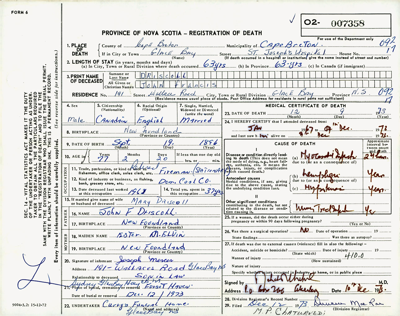 Male Death Registration: Year: 1973 number: 7358