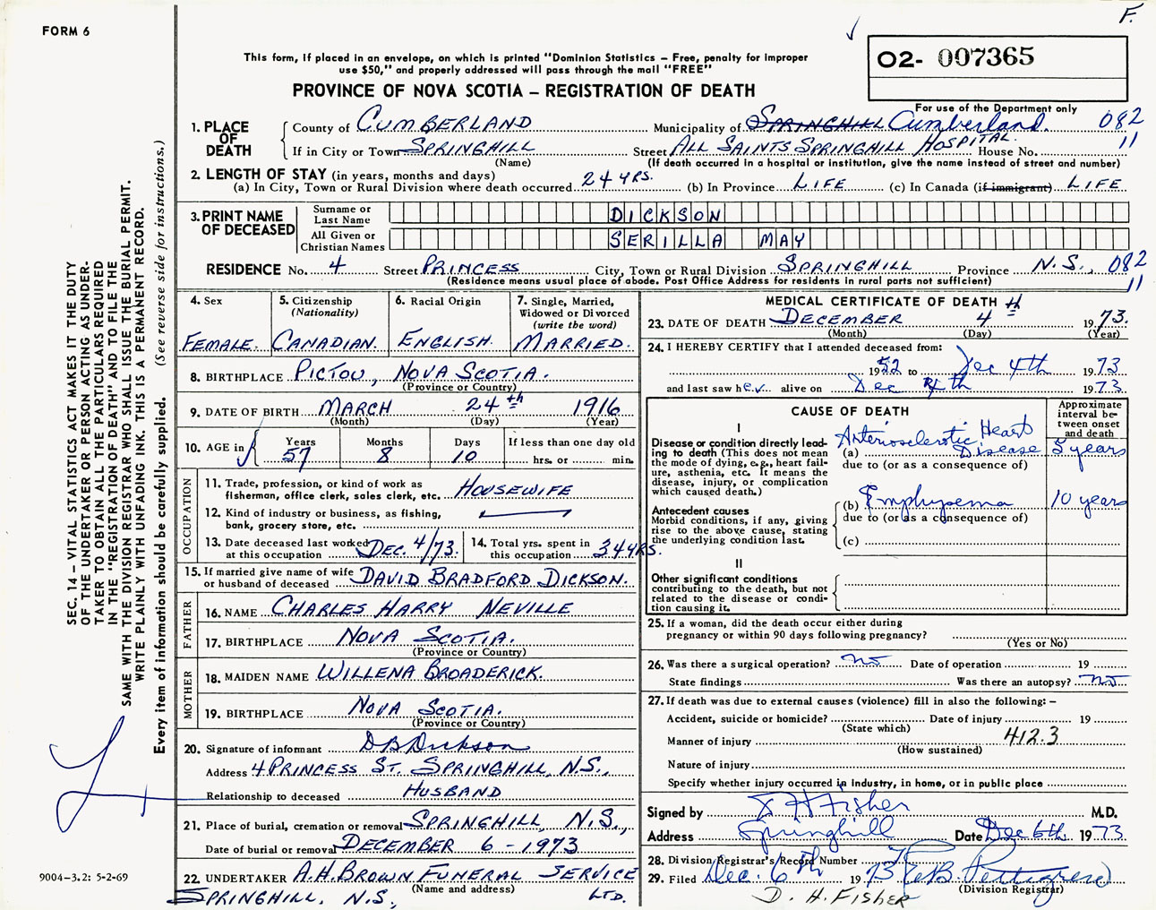 Female Death Registration: Year: 1973 number: 7365