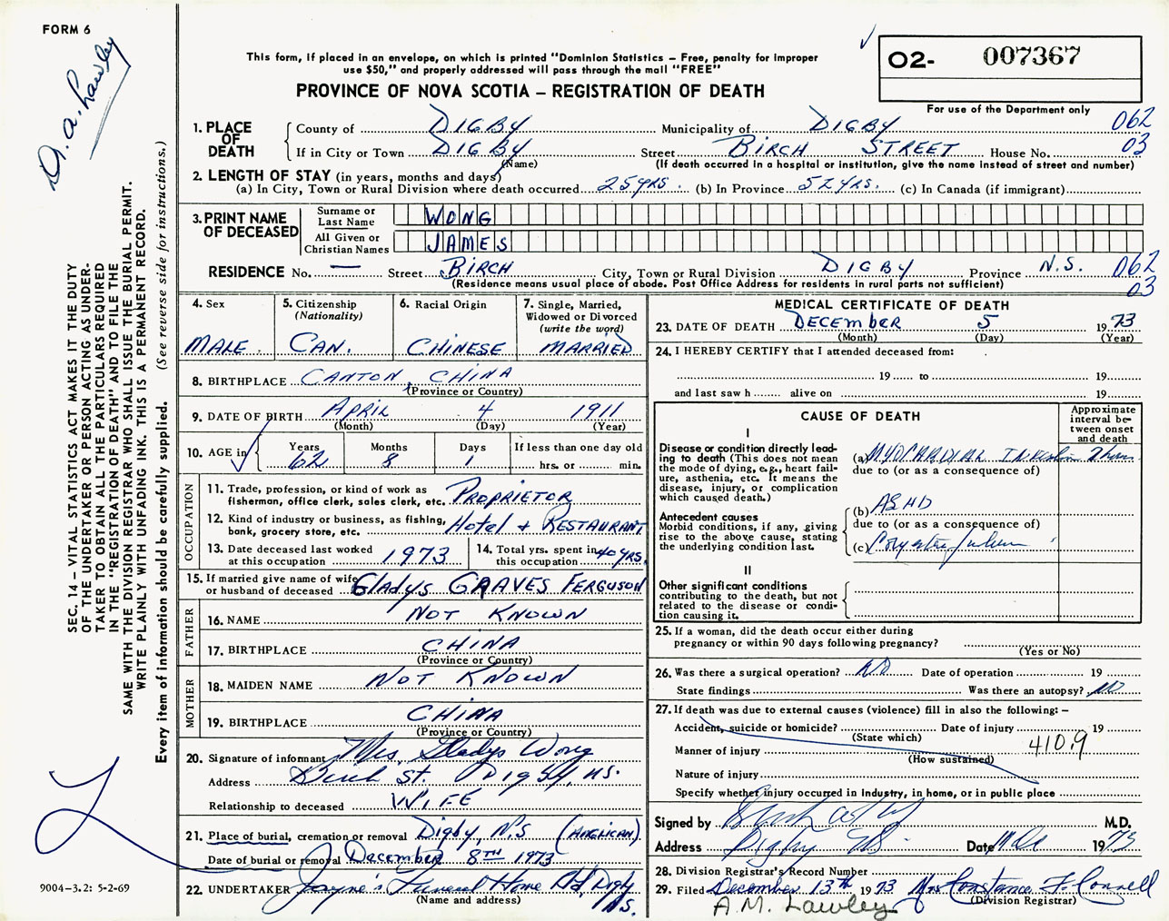 Male Death Registration: Year: 1973 number: 7367