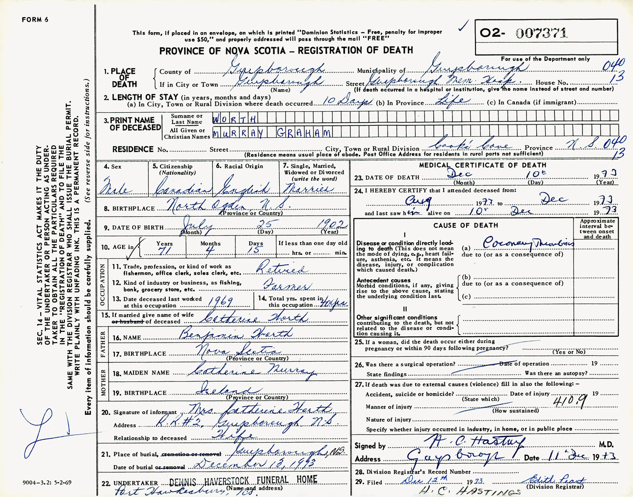 Male Death Registration: Year: 1973 number: 7371