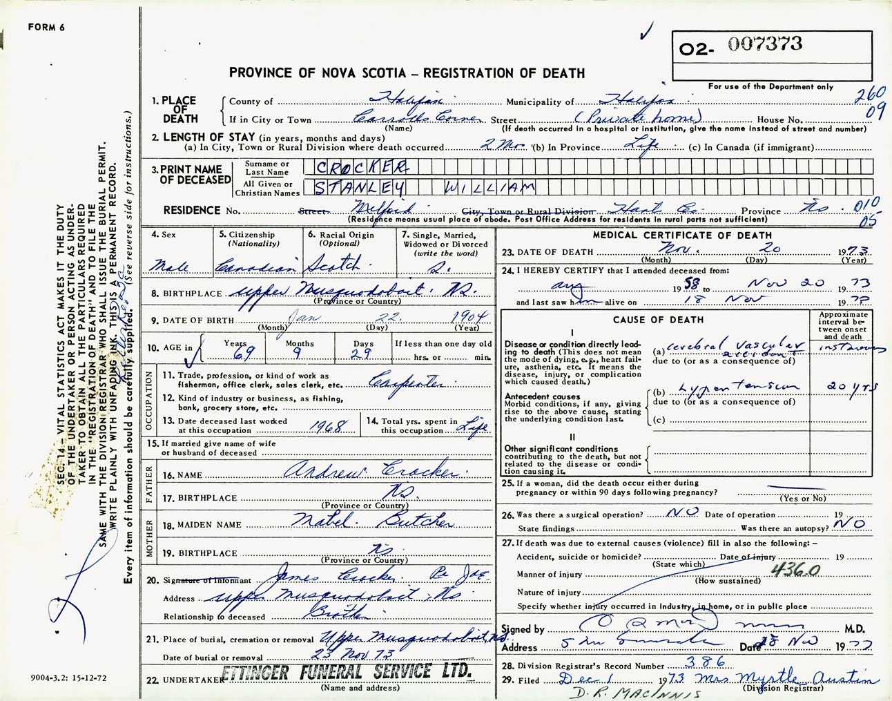 Male Death Registration: Year: 1973 number: 7373