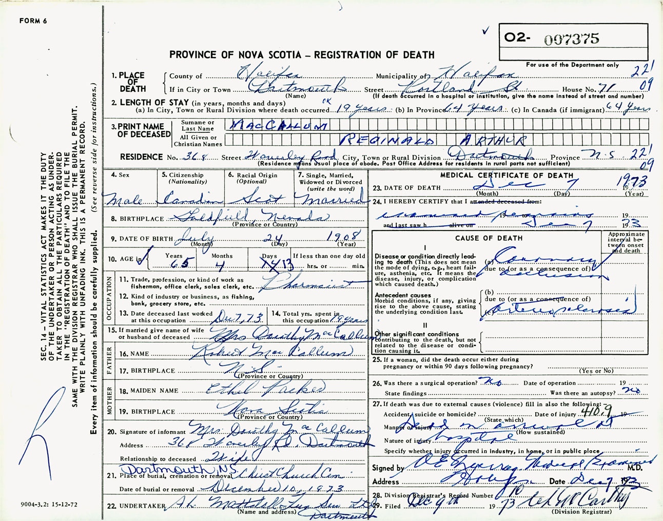 Male Death Registration: Year: 1973 number: 7375
