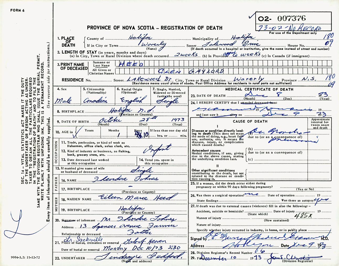 Male Death Registration: Year: 1973 number: 7376
