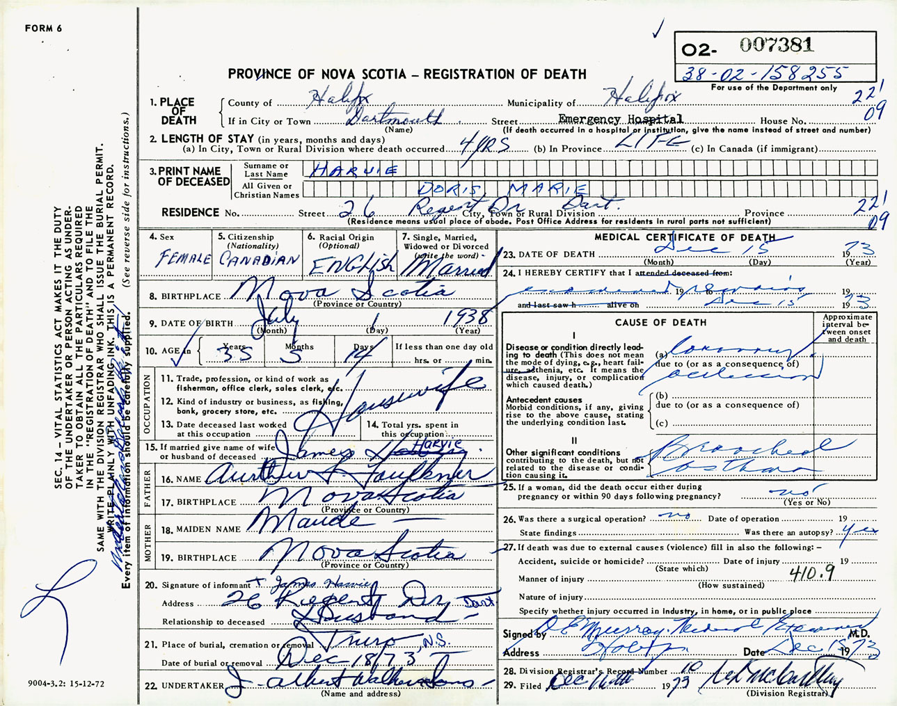 Female Death Registration: Year: 1973 number: 7381
