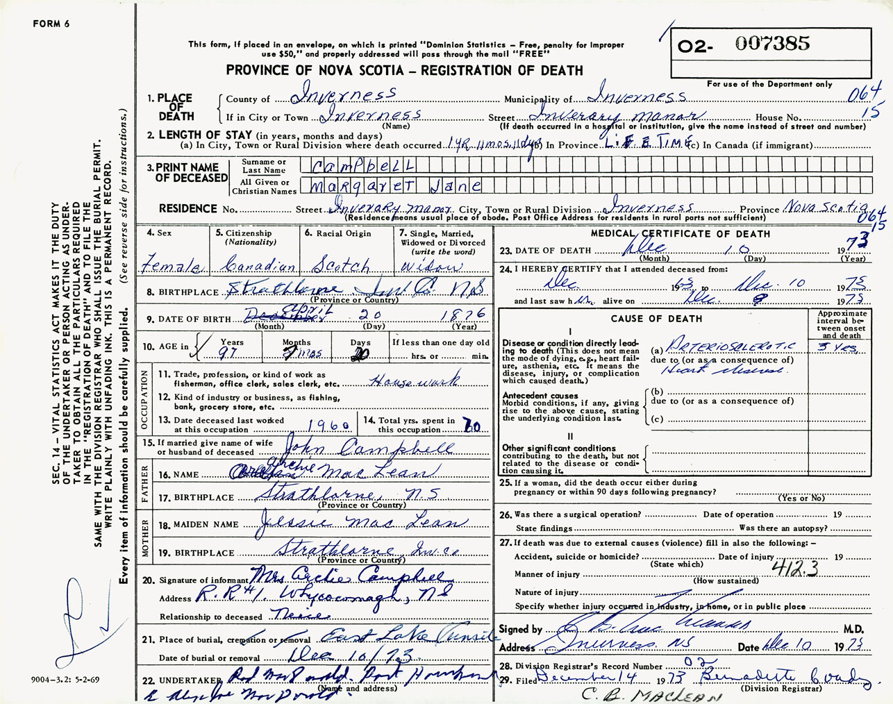 Female Death Registration: Year: 1973 number: 7385