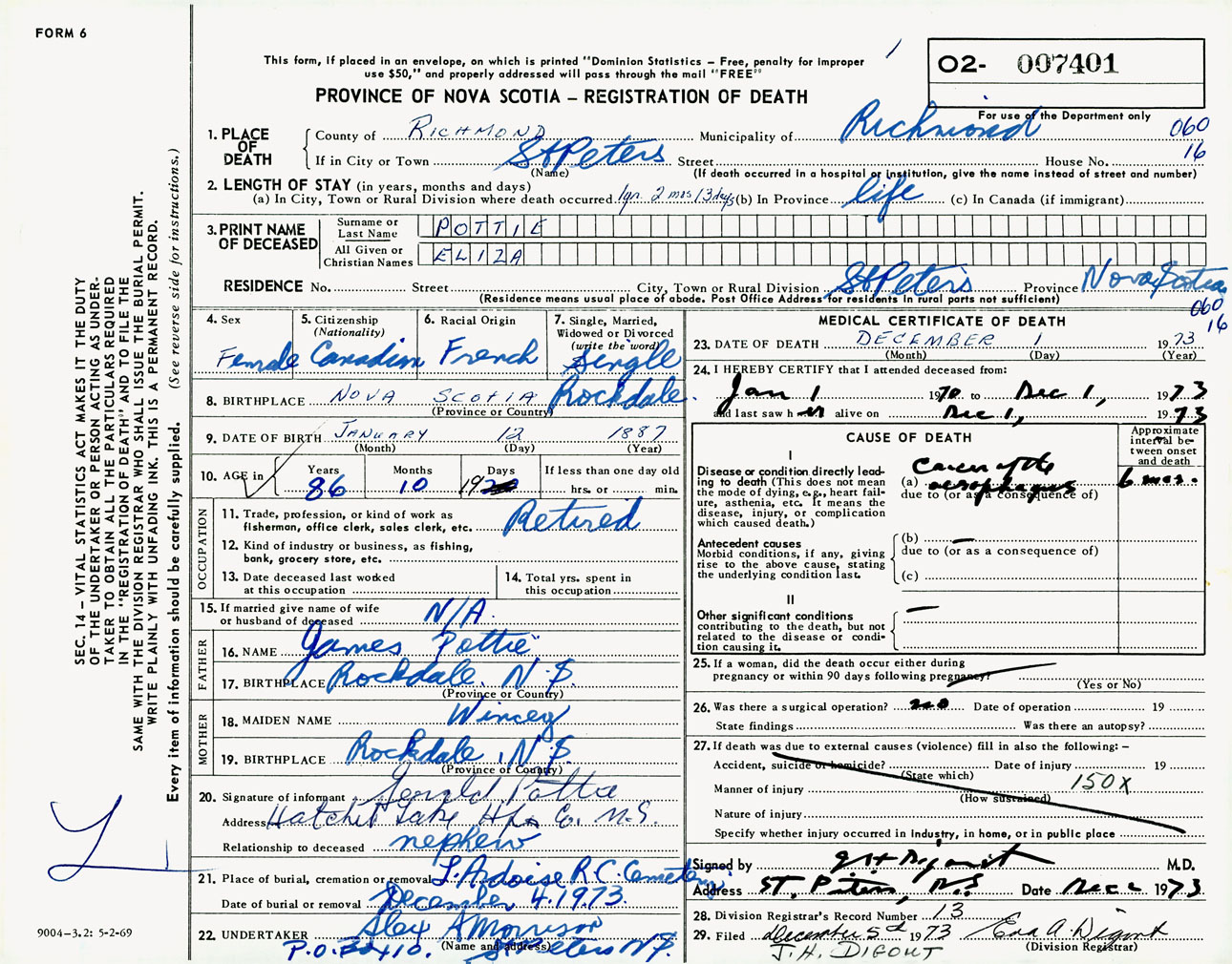 Female Death Registration: Year: 1973 number: 7401