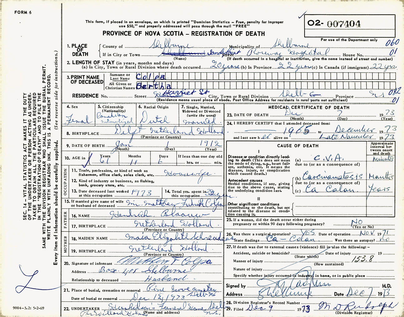 Female Death Registration: Year: 1973 number: 7404