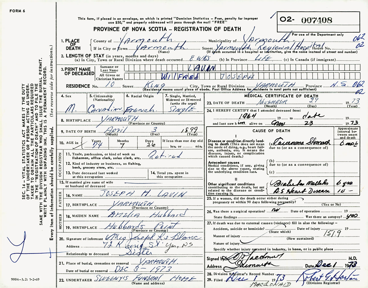 Male Death Registration: Year: 1973 number: 7408