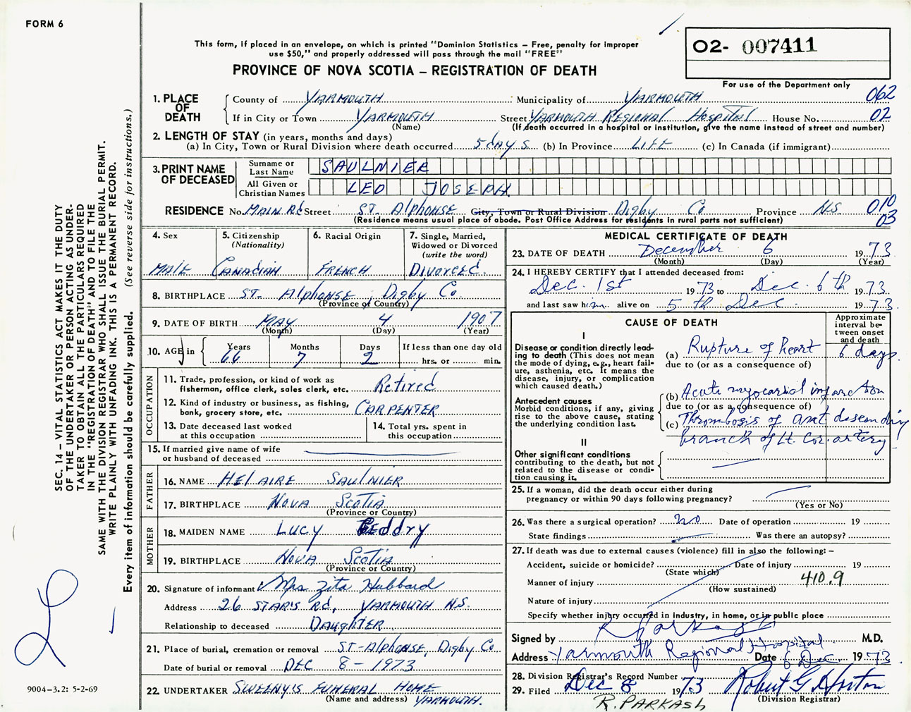 Male Death Registration: Year: 1973 number: 7411