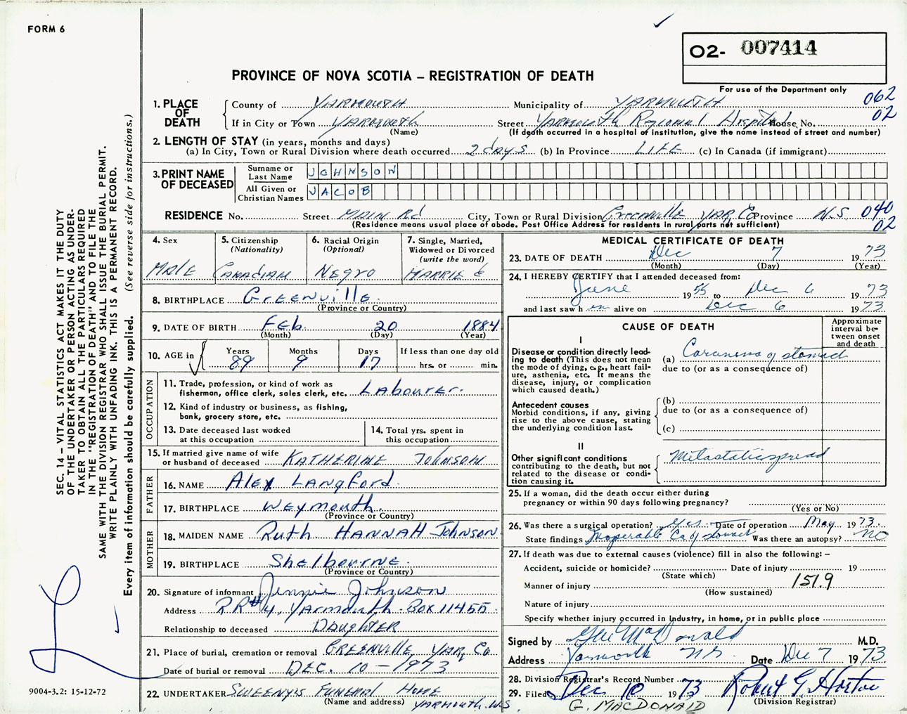 Male Death Registration: Year: 1973 number: 7414