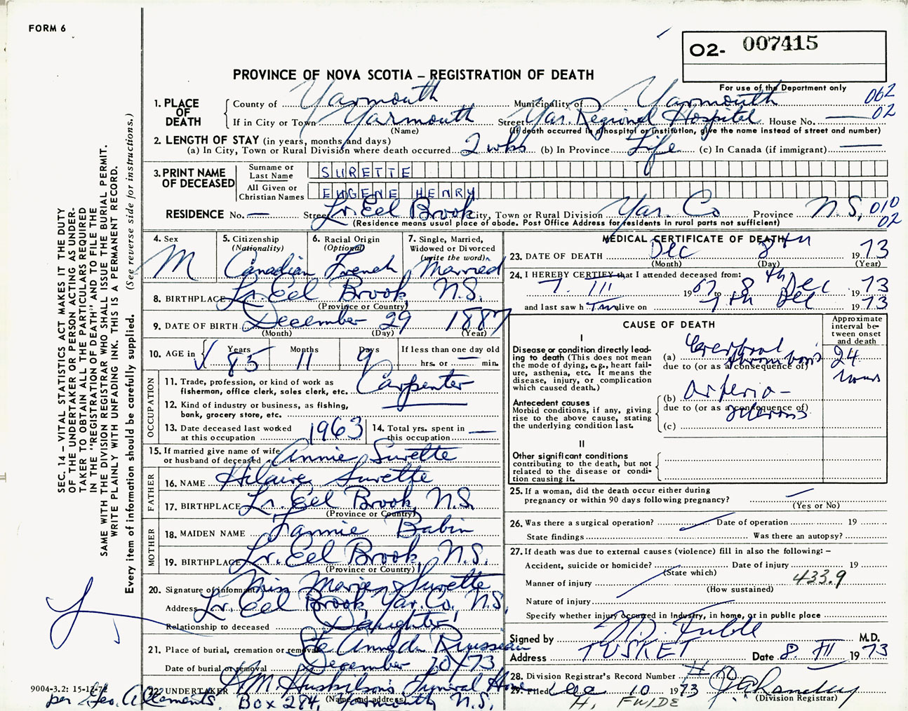 Male Death Registration: Year: 1973 number: 7415