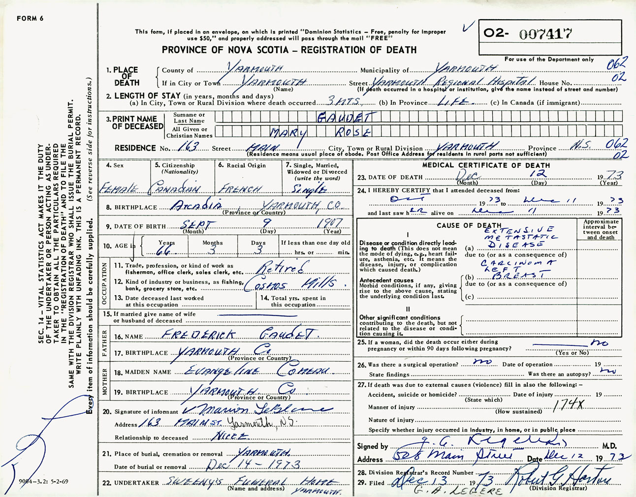 Female Death Registration: Year: 1973 number: 7417