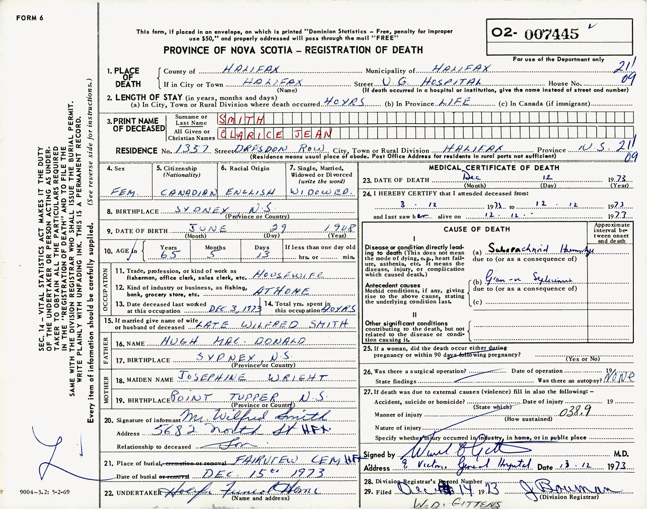Female Death Registration: Year: 1973 number: 7445