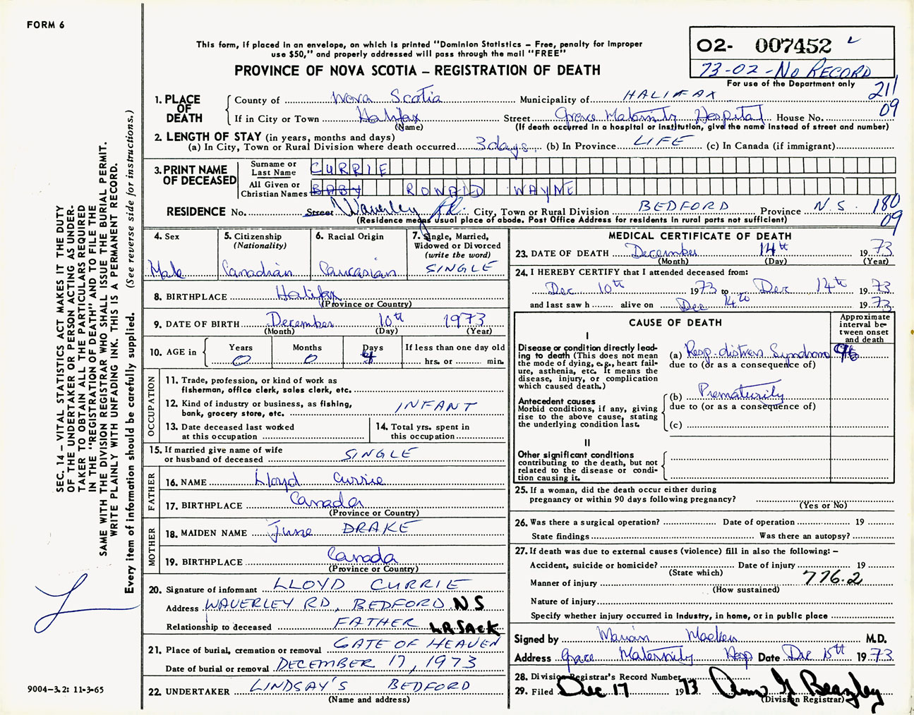 Male Death Registration: Year: 1973 number: 7452