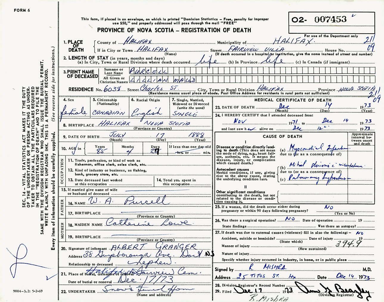 Female Death Registration: Year: 1973 number: 7453