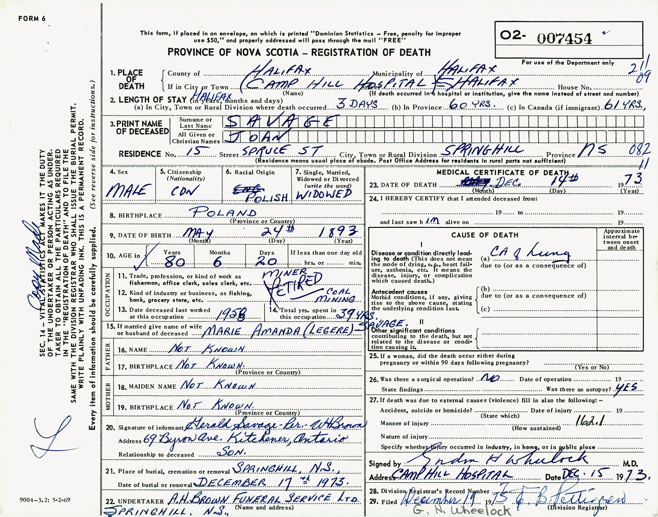 Male Death Registration: Year: 1973 number: 7454