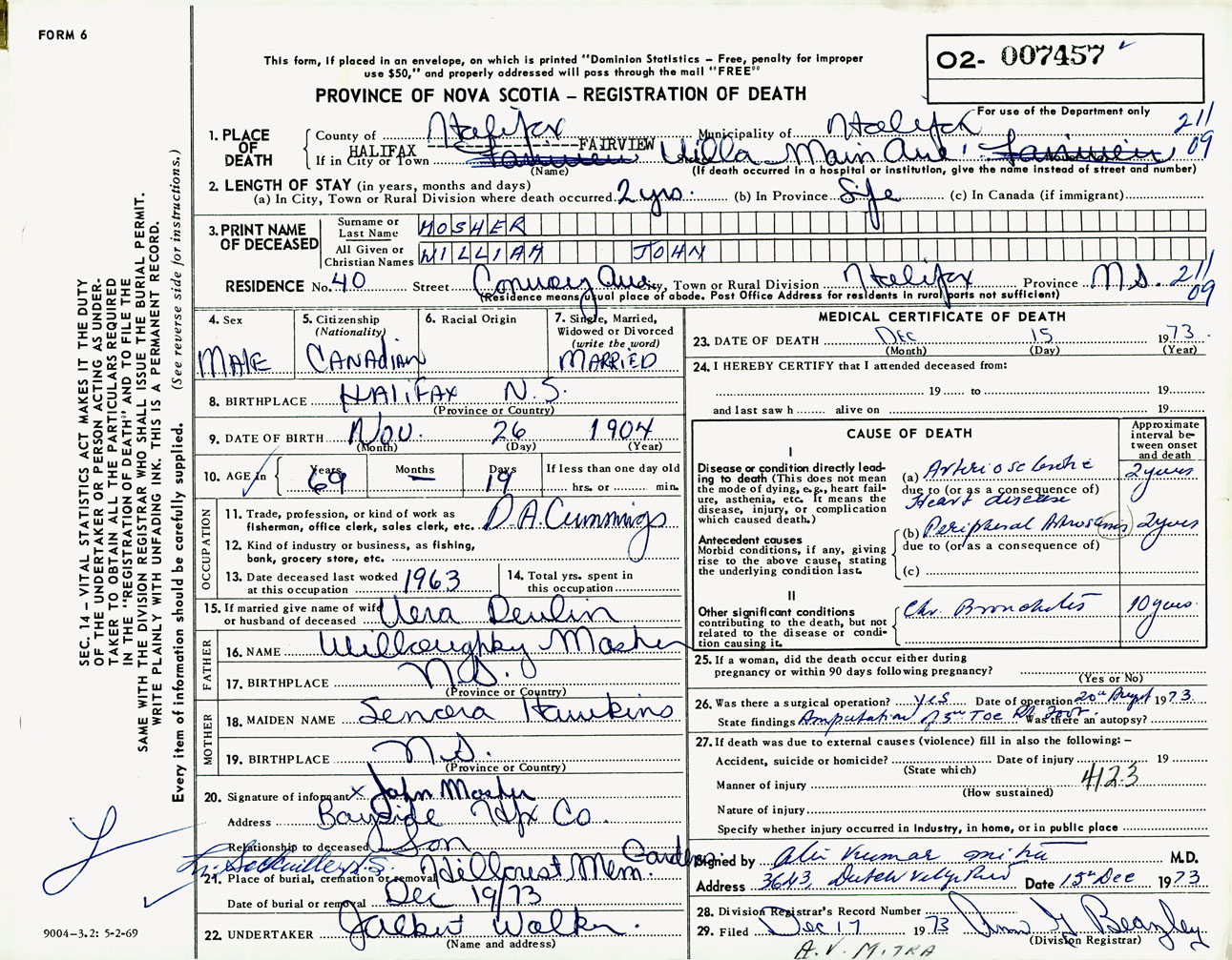 Male Death Registration: Year: 1973 number: 7457
