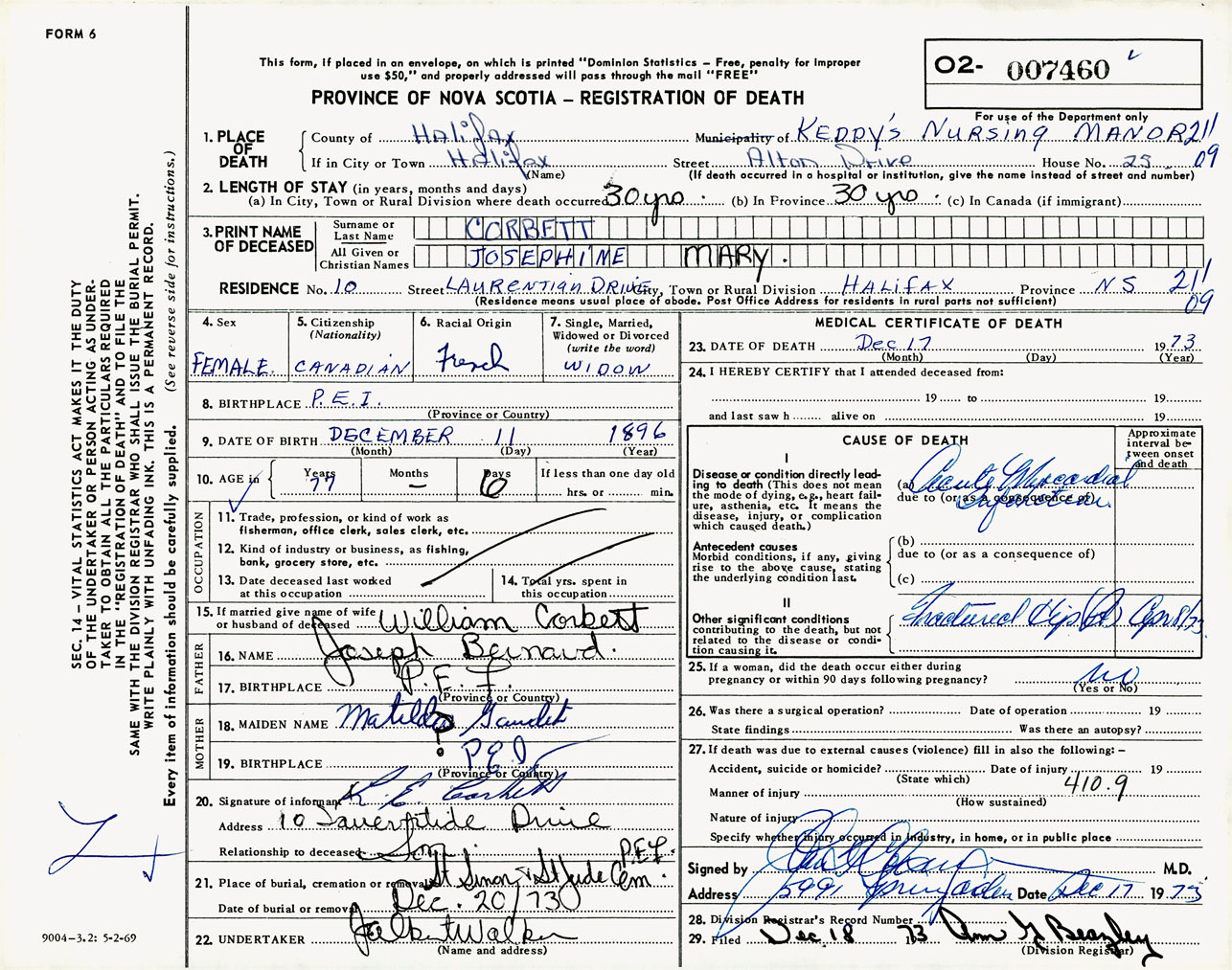 Female Death Registration: Year: 1973 number: 7460