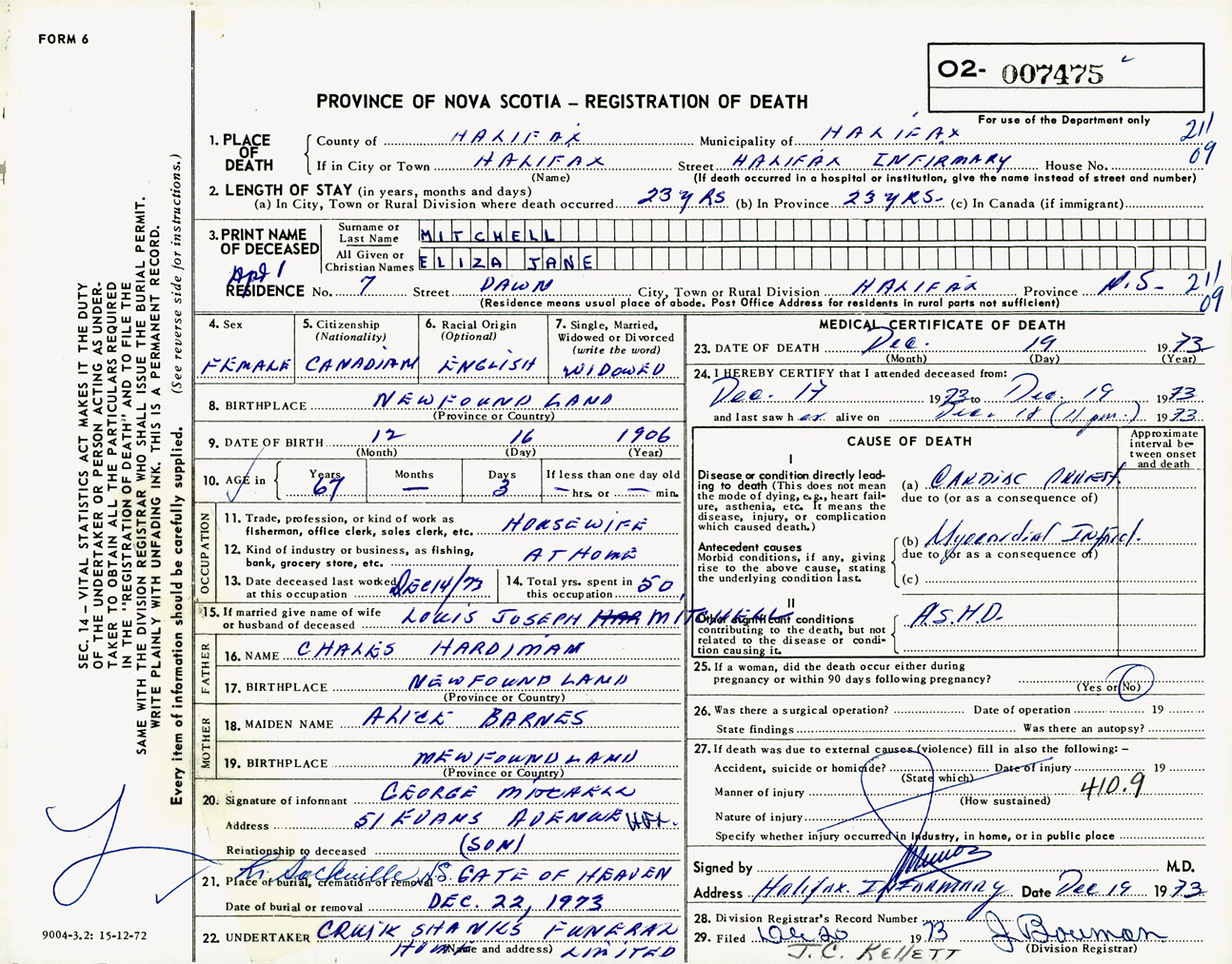 Female Death Registration: Year: 1973 number: 7475
