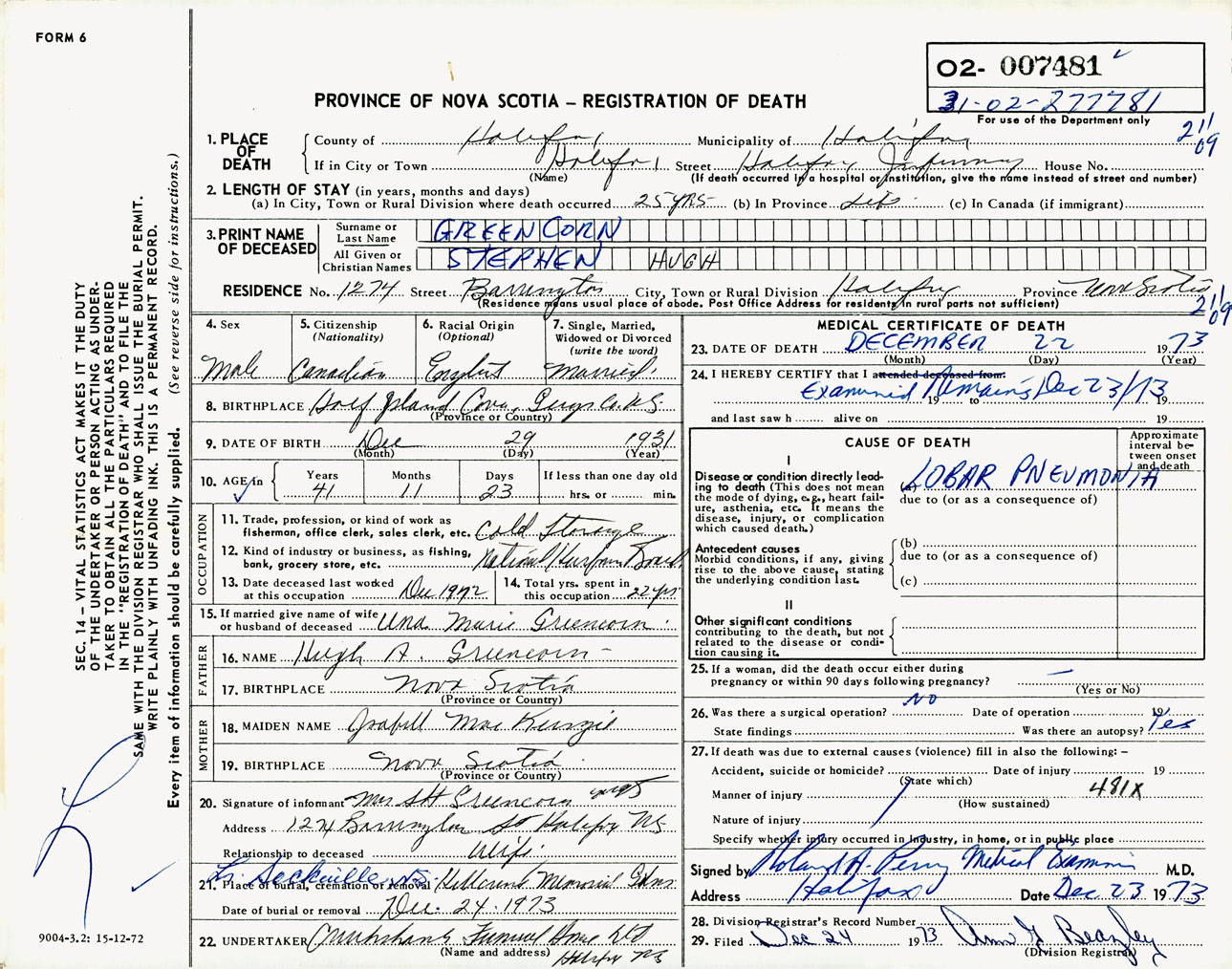 Male Death Registration: Year: 1973 number: 7481