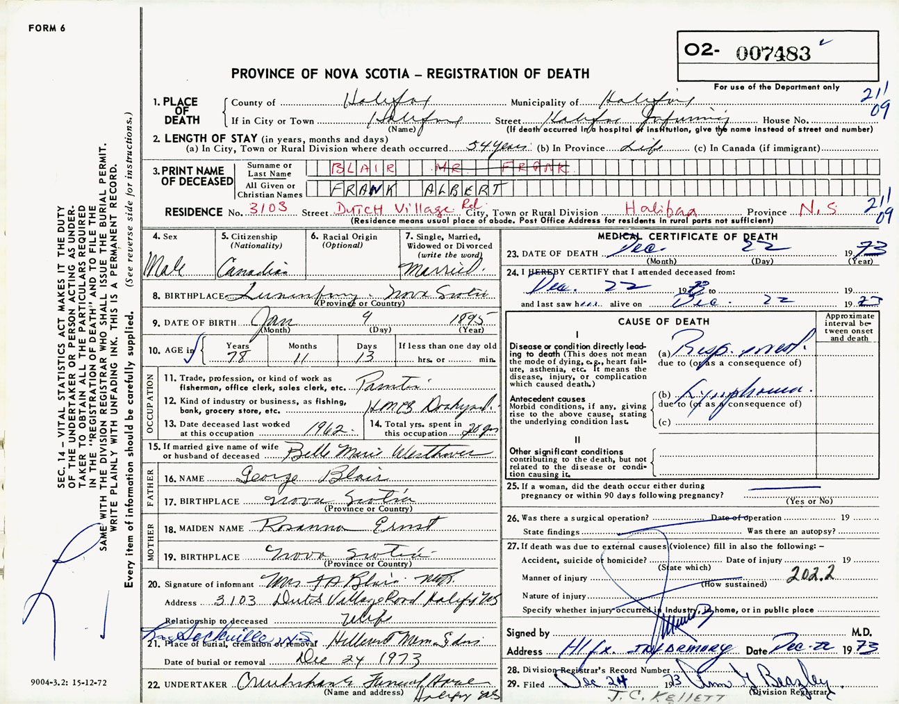 Male Death Registration: Year: 1973 number: 7483