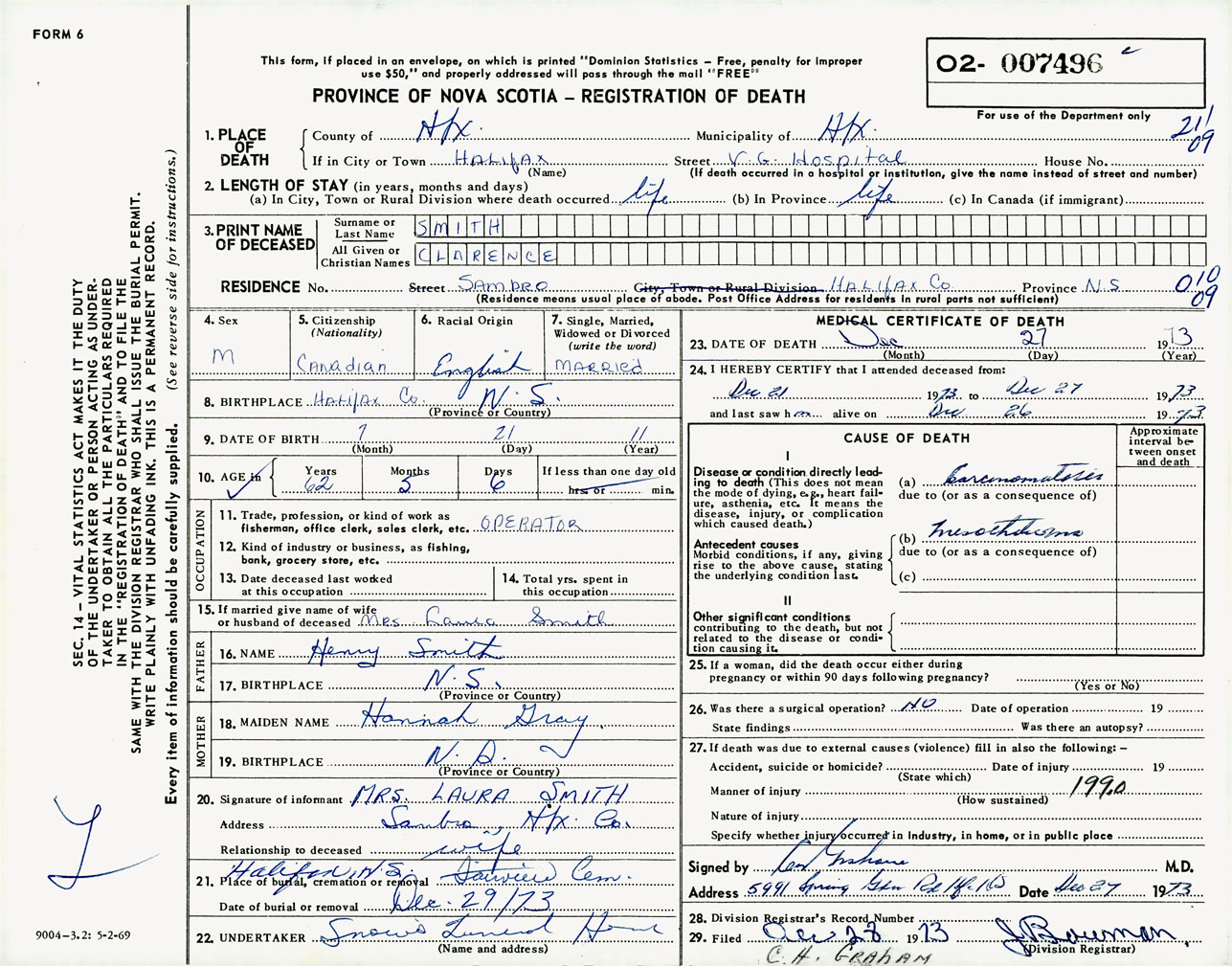 Male Death Registration: Year: 1973 number: 7496