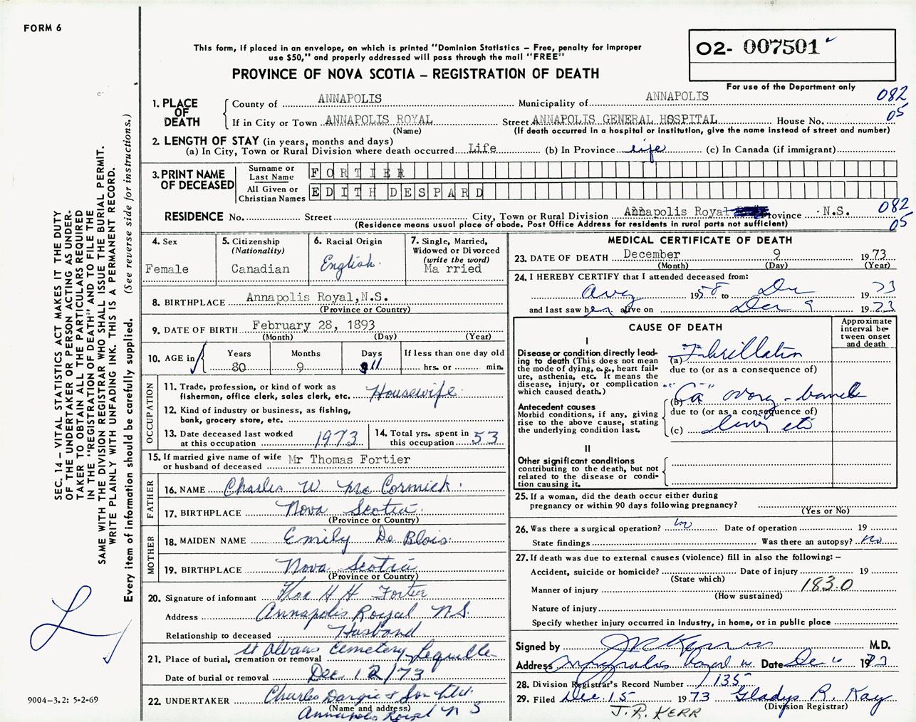 Female Death Registration: Year: 1973 number: 7501