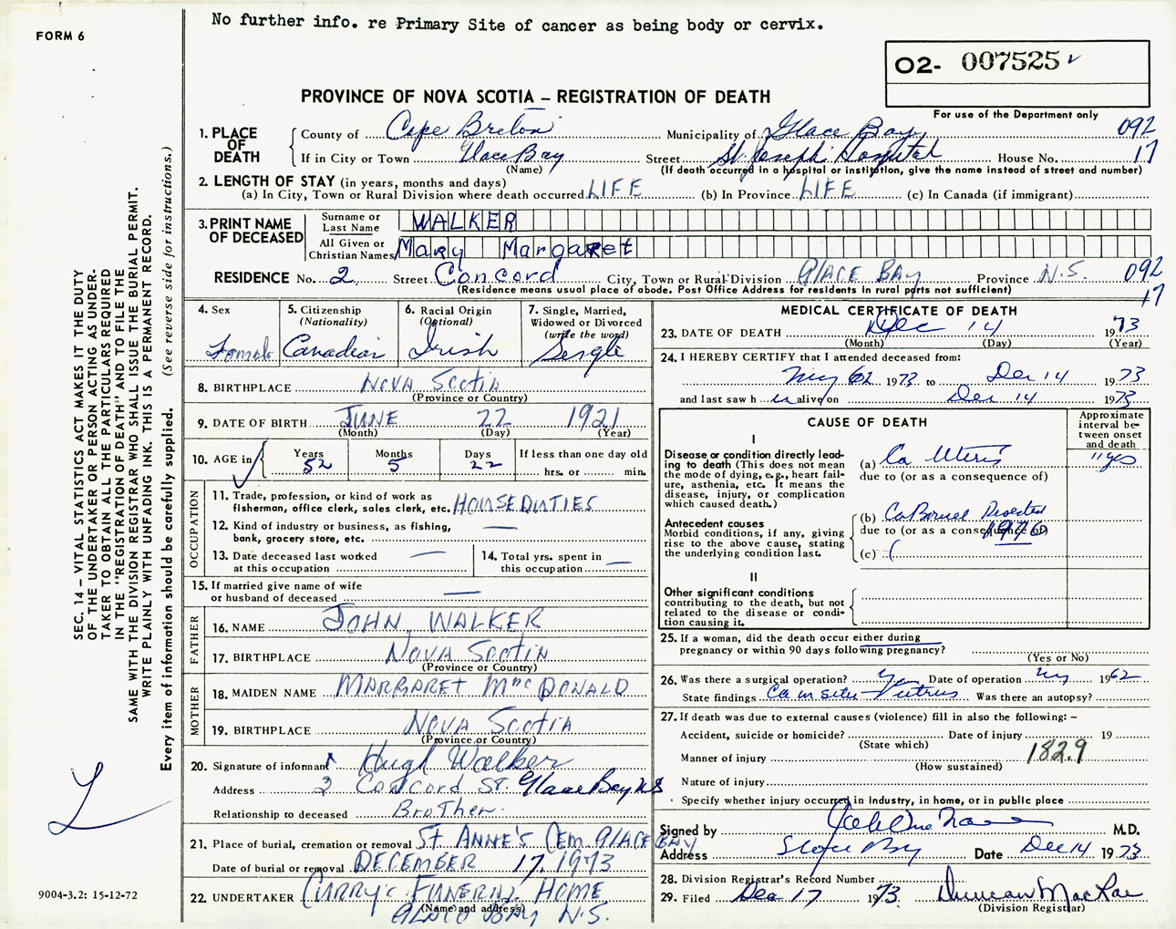 Female Death Registration: Year: 1973 number: 7525