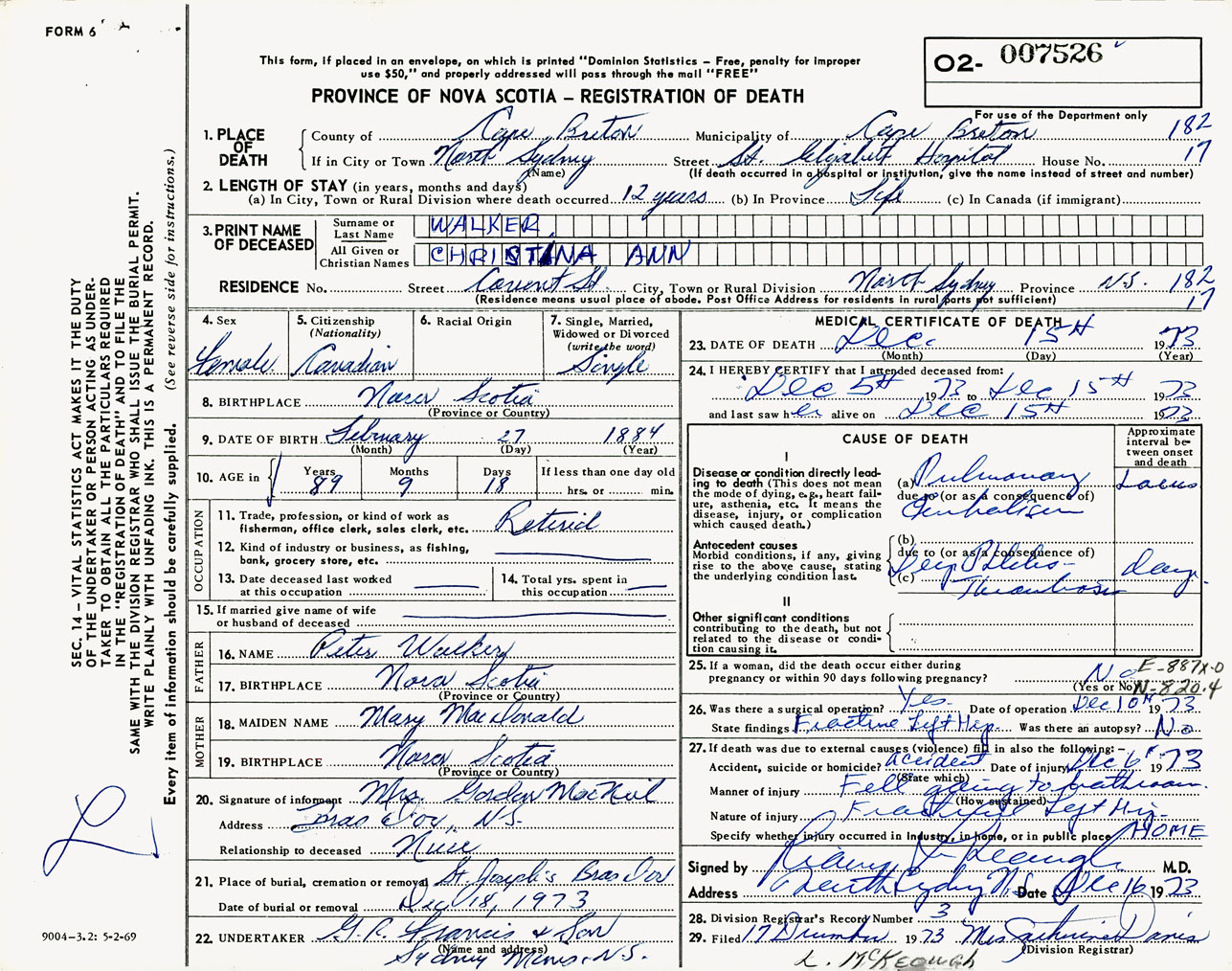 Female Death Registration: Year: 1973 number: 7526
