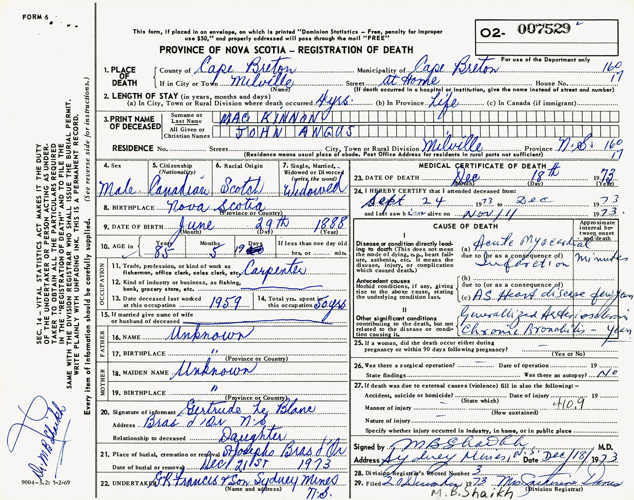 Male Death Registration: Year: 1973 number: 7529