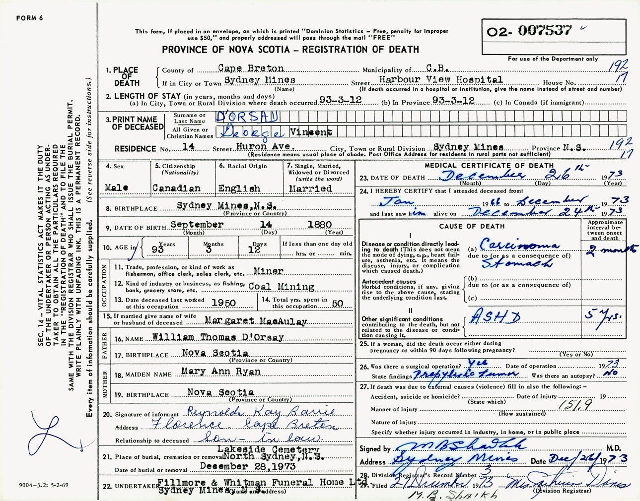 Male Death Registration: Year: 1973 number: 7537
