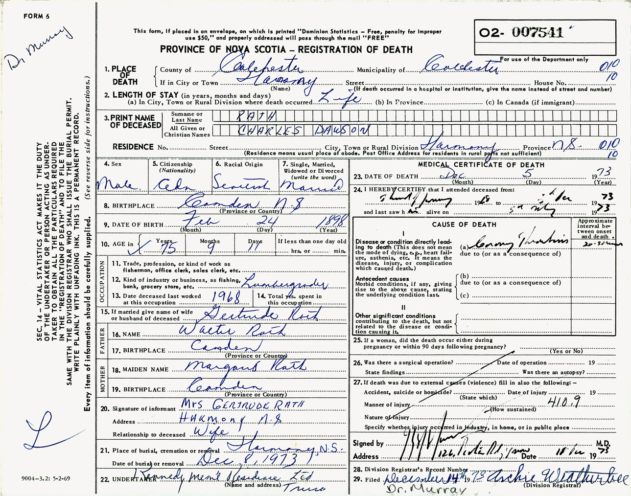 Male Death Registration: Year: 1973 number: 7541