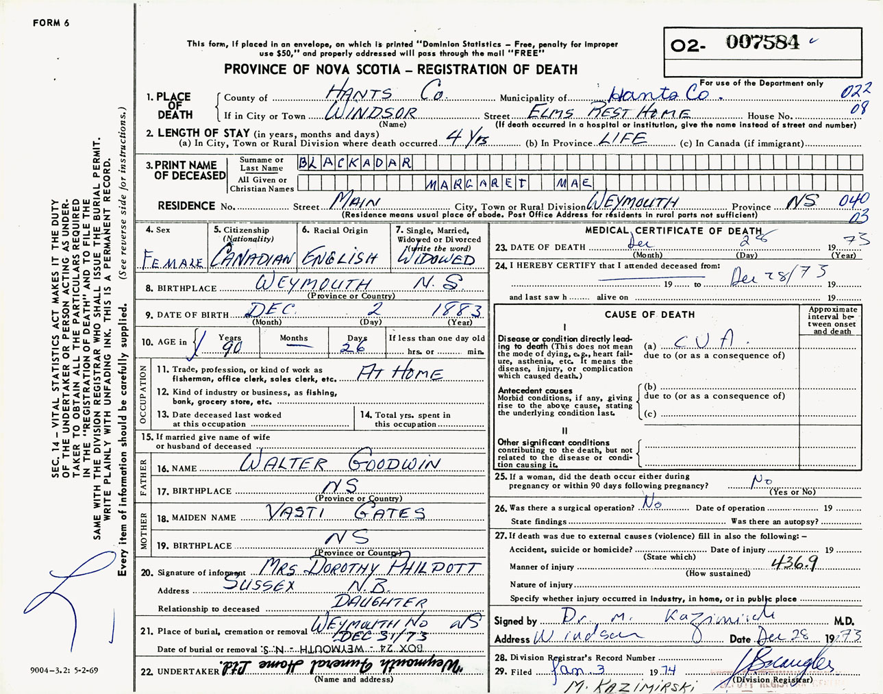 Female Death Registration: Year: 1973 number: 7584