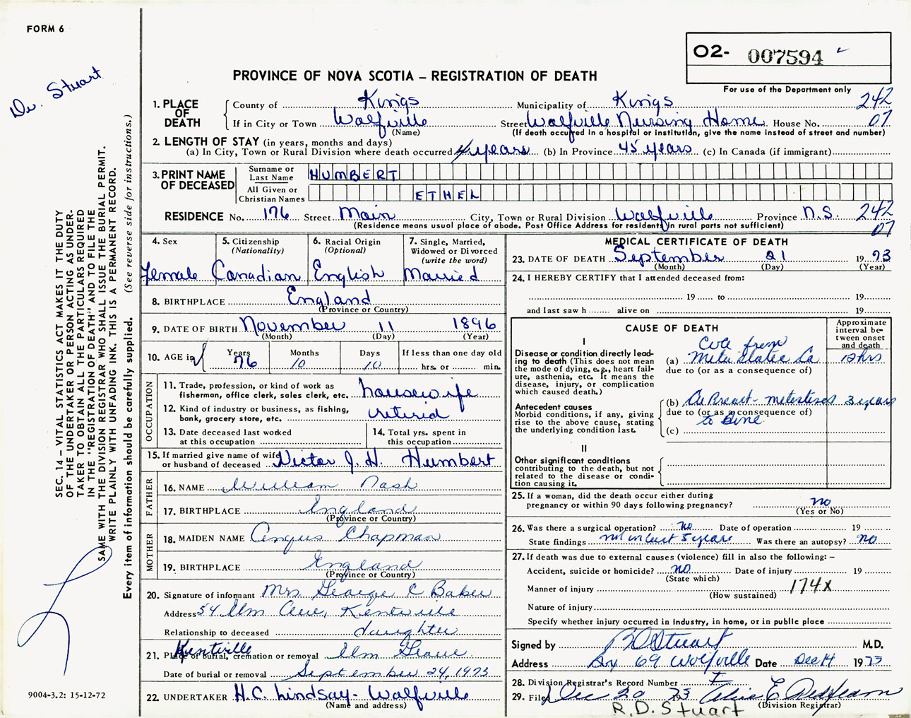 Female Death Registration: Year: 1973 number: 7594